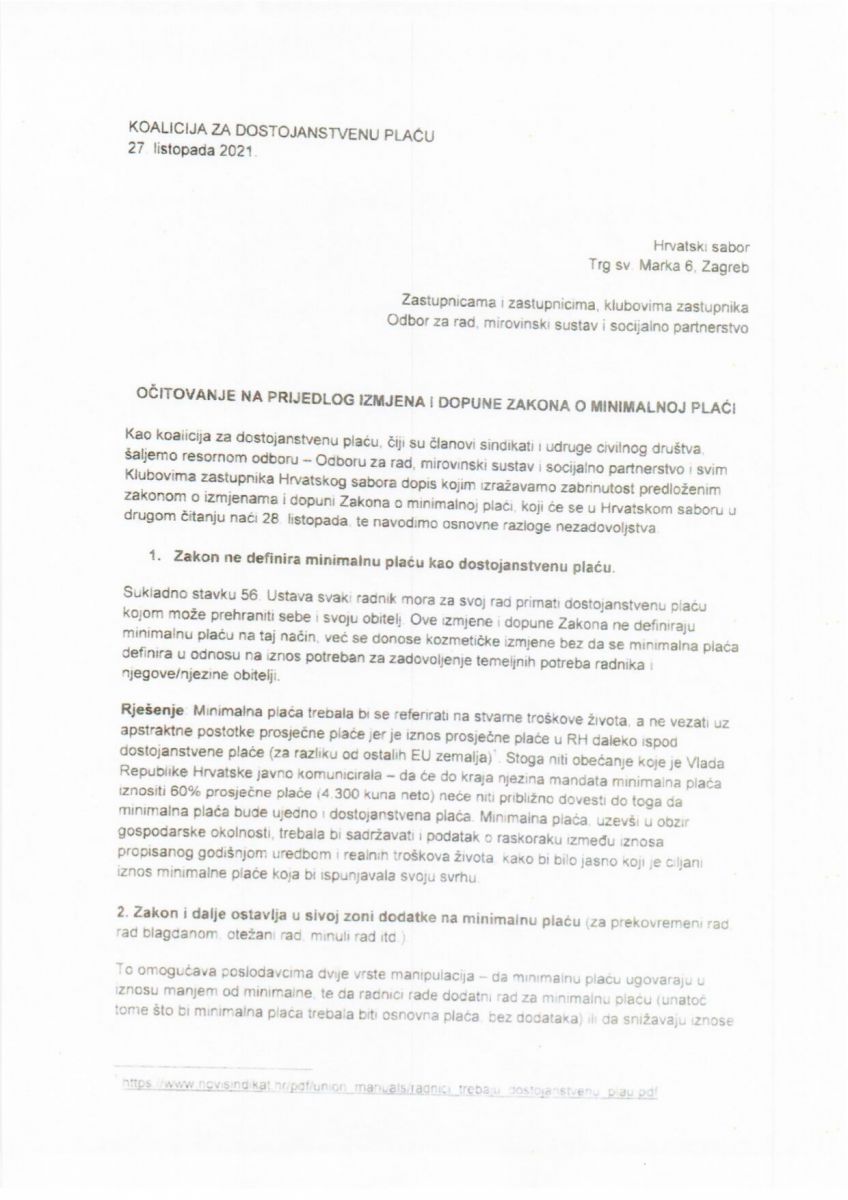 Kao koalicija za dostojanstvenu plaću, čiji su članovi sindikati i udruge civilnog društva, šaljemo resornom odboru – Odboru za rad, mirovinski sustav i socijalno partnerstvo i svim Klubovima zastupnika Hrvatskog sabora dopis kojim izražavamo zabrinutost predloženim zakonom o izmjenama i dopuni Zakona o minimalnoj plaći, koji će se u Hrvatskom saboru u drugom čitanju naći 28. listopada, te navodimo osnovne razloge nezadovoljstva.
