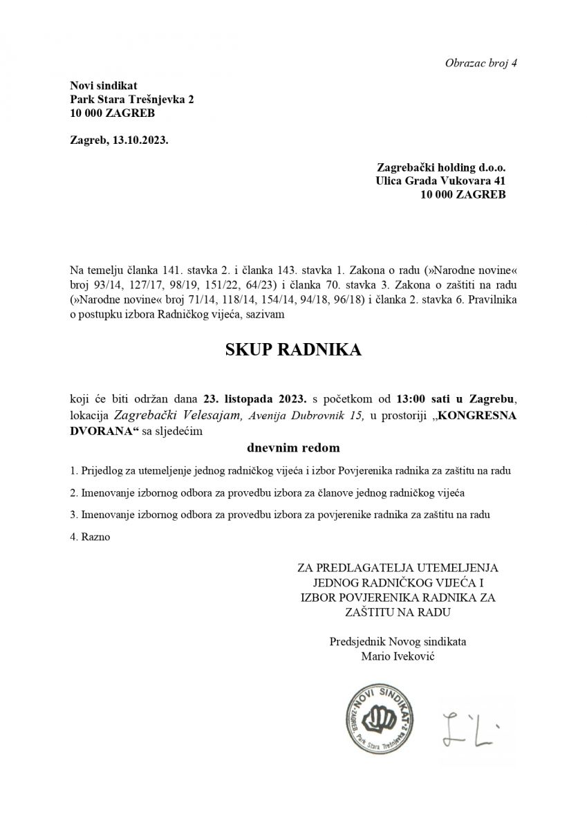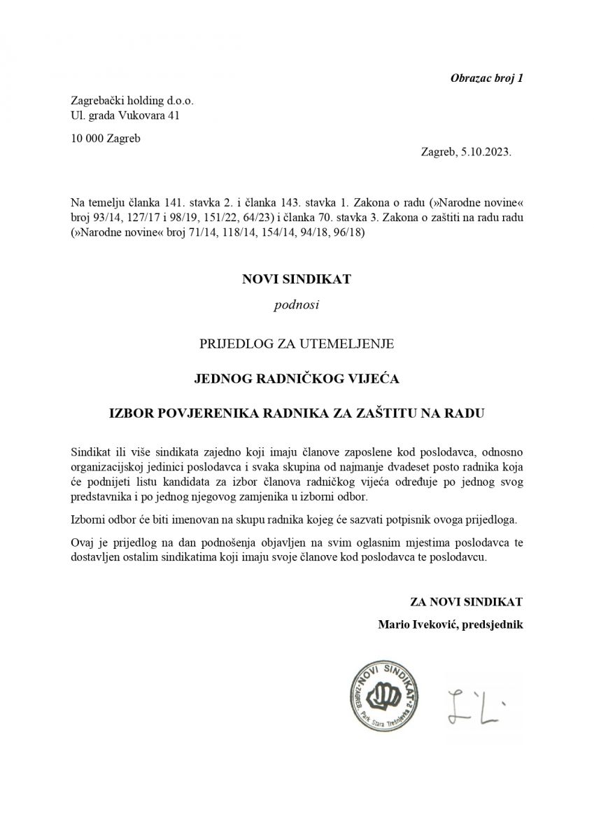 Novi sindikat dostavio je poslodavcu Prijedlog za utemeljenje jednog radničkoga vijeća i izbor povjerenika radnika za zaštitu na radu u Zagrebačkom Holdingu na dan 5. 10. 2023. godine. Kao predlagatelj ovlašteni smo sazvati skup radnika Zagrebačkog holdinga d.o.o.