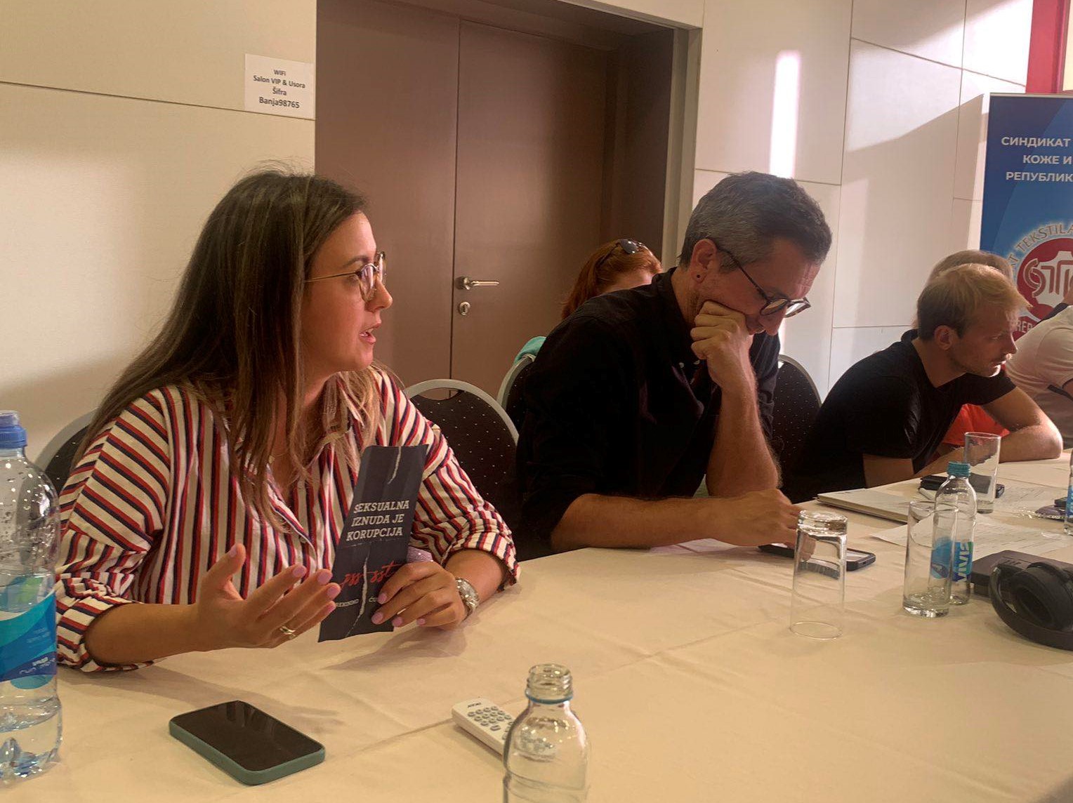 Kolegice iz Helsinškog parlamenta građana govorile su o još jednom važnom problemu – seksualnom iznuđivanju. HPG je pokrenuo kampanju “Seksualna iznuda je korupcija. Prekinimo ćutanje!”, kroz koju nastoje podići svijest građanki i građana BiH o važnosti prepoznavanja i prijavljivanja seksualne iznude. Radi se o obliku ucjene u kojemu nadređeni od radnica traže seksualne usluge u zamjenu za neka osnovna radnička prava, npr. dane godišnjeg odmora.