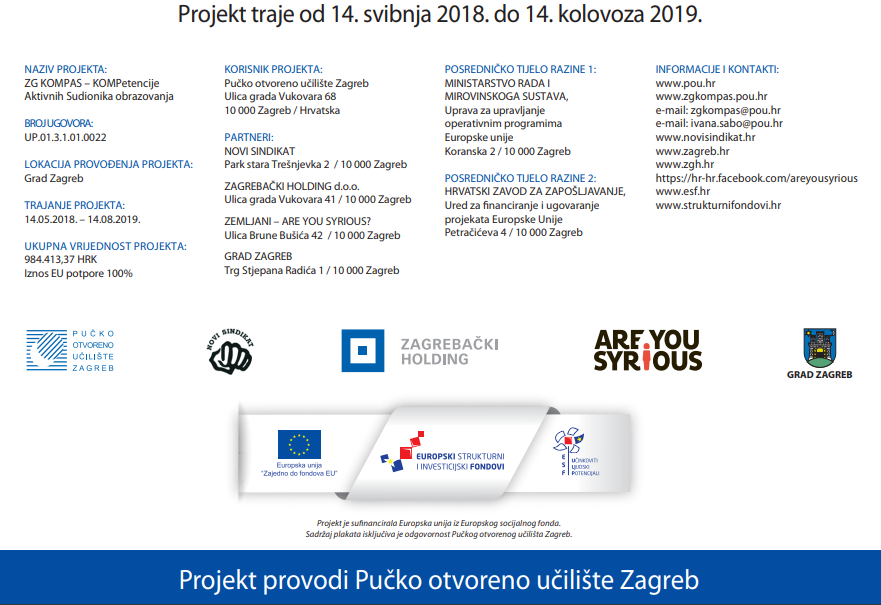 Projektom ZG KOMPAS – KOMPetencije Aktivnih Sudionika obrazovanja polaznicima će se omogućiti stjecanje sveobuhvatne edukacije, koja, uz stjecanje stručnih i praktičnih znanja obuhvaća i treninge mekih vještina te temeljitu pripremu za izlazak na konkurentno tržište rada. Obrazovni program započinje modulom hrvatskog jezika koji će biti organiziran isključivo za azilante. Nakon toga, 60 nezaposlenih pripadnika ranjivih skupina dobit će priliku za sudjelovanje u jednom od programa osposobljavanja za kuhara/icu, konobara/icu, vrtlara/icu, njegovatelja/icu, gerontodomaćina/icu i dadilju te priliku za pohađanje praktične nastave u podružnicama partnerskih organizacija. Također, u obrazovni program bit će uključeno i pohađanje modula mekih vještina koji će razviti i provesti stručnjaci iz partnerskih organizacija. Navedeni moduli obuhvaćaju sljedeća područja - modul osnova radnog prava, modul komunikacijskih kompetencija i modul kulturne razmjene. Za potrebe nastavnog pro grama tj. za pohađanje novoizrađenih nastavnih modula bit će izdan Priručnik za ulazak u svijet rada, prvo izdanje u Republici Hrvatskoj namijenjeno pripadnicima ranjivih skupina koje daje informativno – savjetodavni pregled tema koje za svrhu imaju ulazak u svijet rada. Ovaj projekt obilježit će i osnivanje Kluba za zapošljavanje koji će provoditi pripremne radionice za izlazak na konkurentno tržište rada (pisanje životopisa, razgovor za posao, poznavanje prava na tržištu rada) te individualne konzultacije za azilante.
